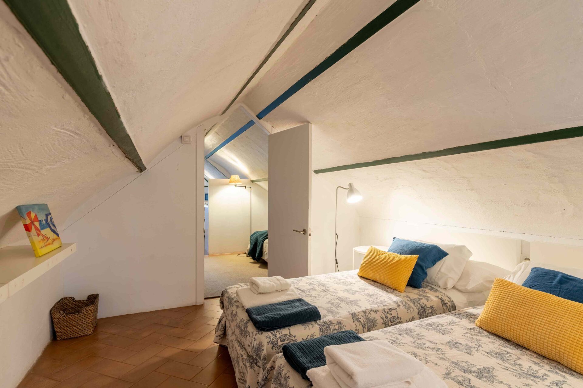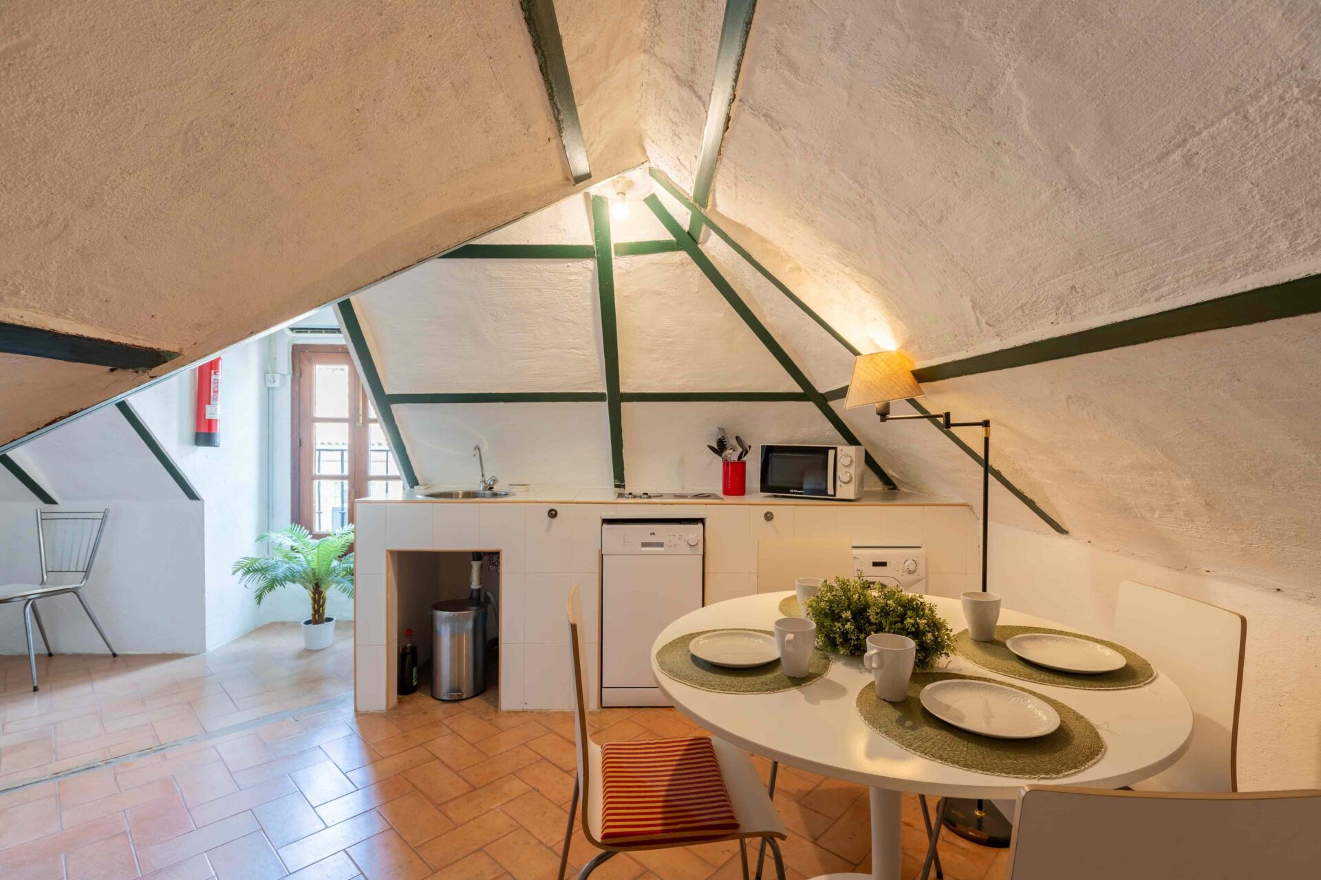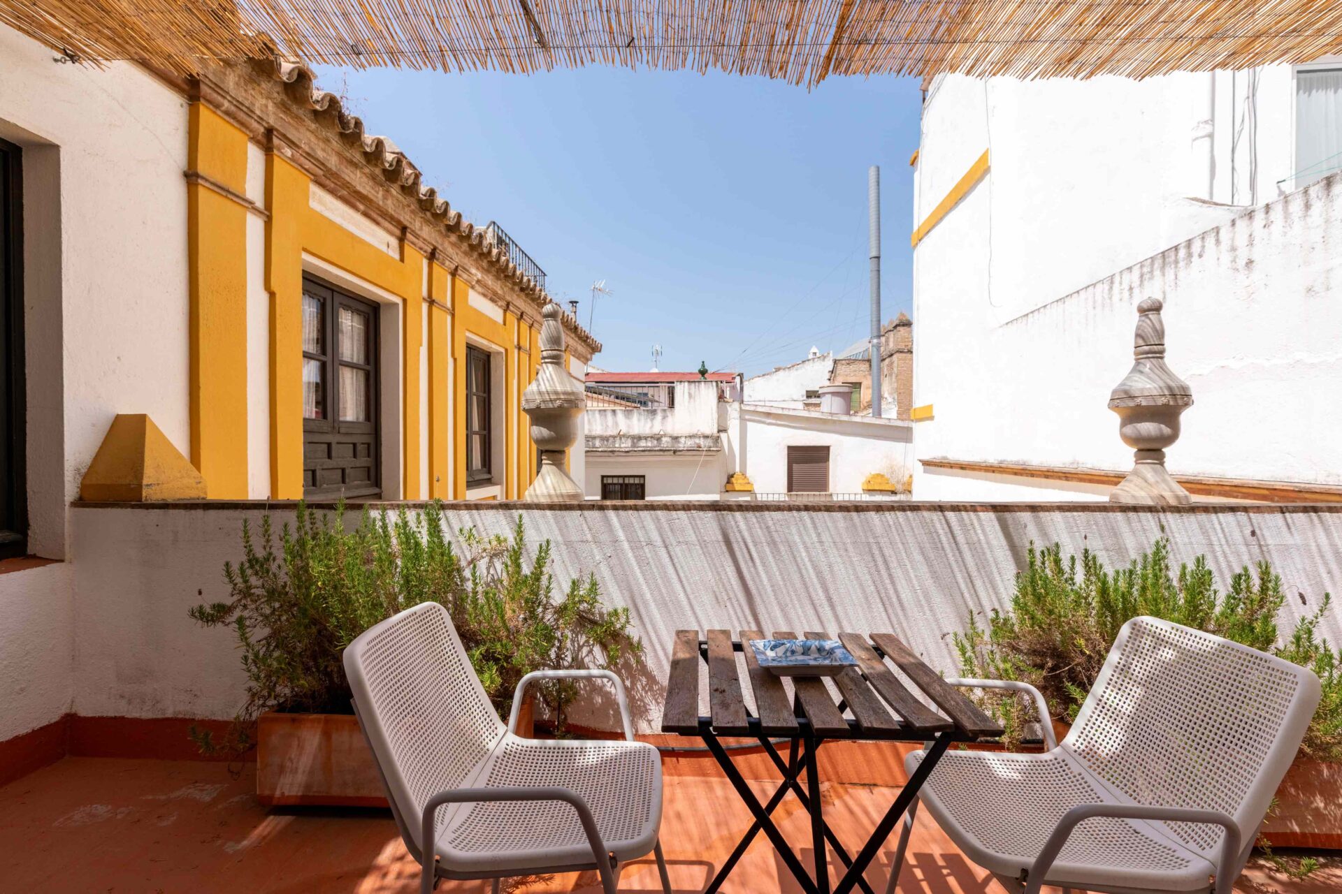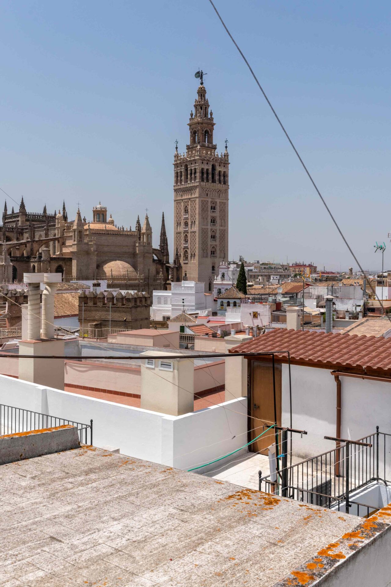 Tras subir por una escalera de piedra de caracol, se llega primero a una gran terraza mirando al jardín y piscina. A continuación al salón que tiene a un lado un baño con ducha y enfrente la buhardilla con una pequeña cocina, pequeña zona de estar y el dormitorio con dos camas individuales donde hay otra terraza mirando a la Catedral. A continuación por la escalera subimos a la habitación principal con baño en suite y unas vistas maravillosas. Si seguimos subiendo, llegamos a la azotea desde donde se ve todo el barrio Santa Cruz, sus increíbles vistas y la Catedral.
