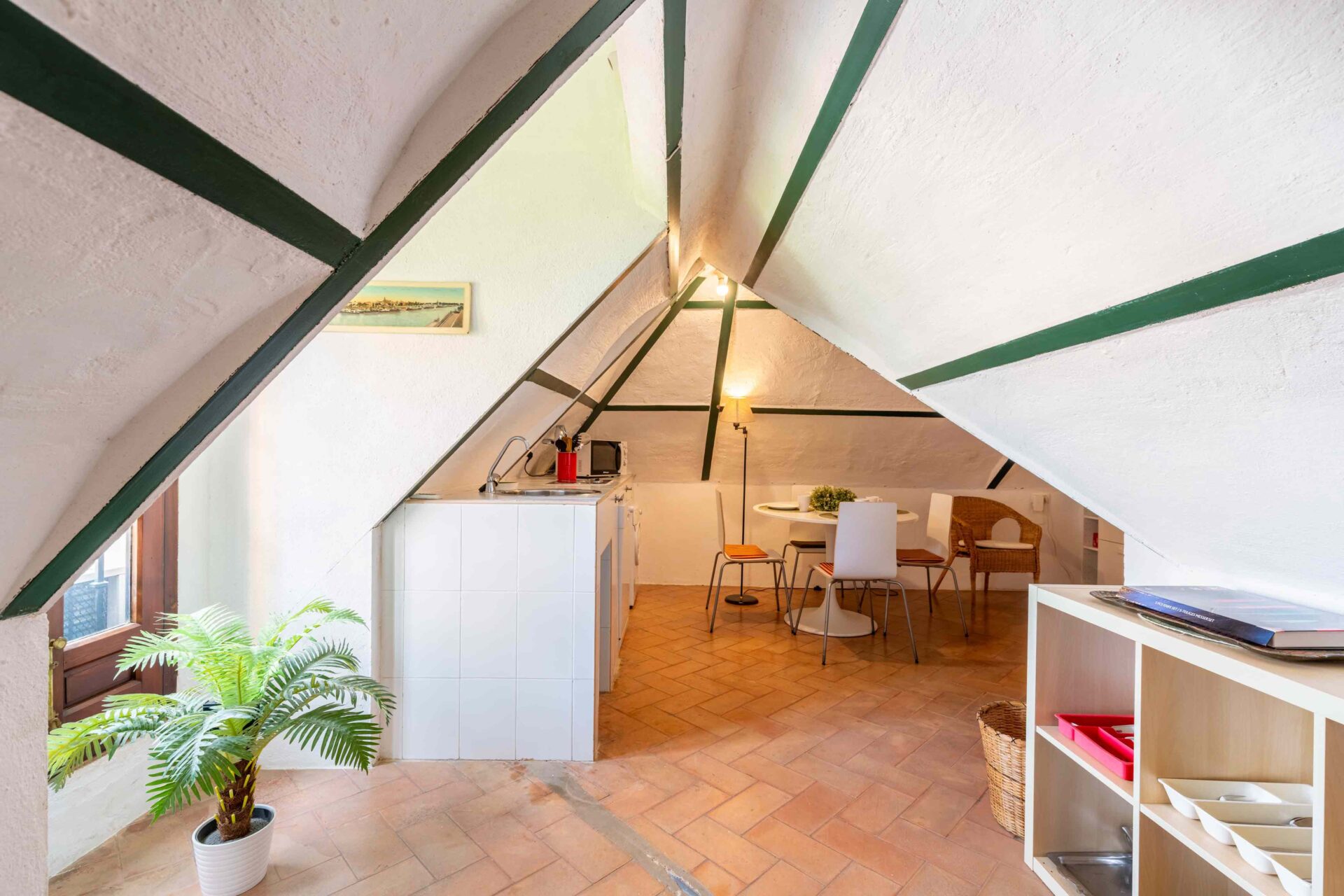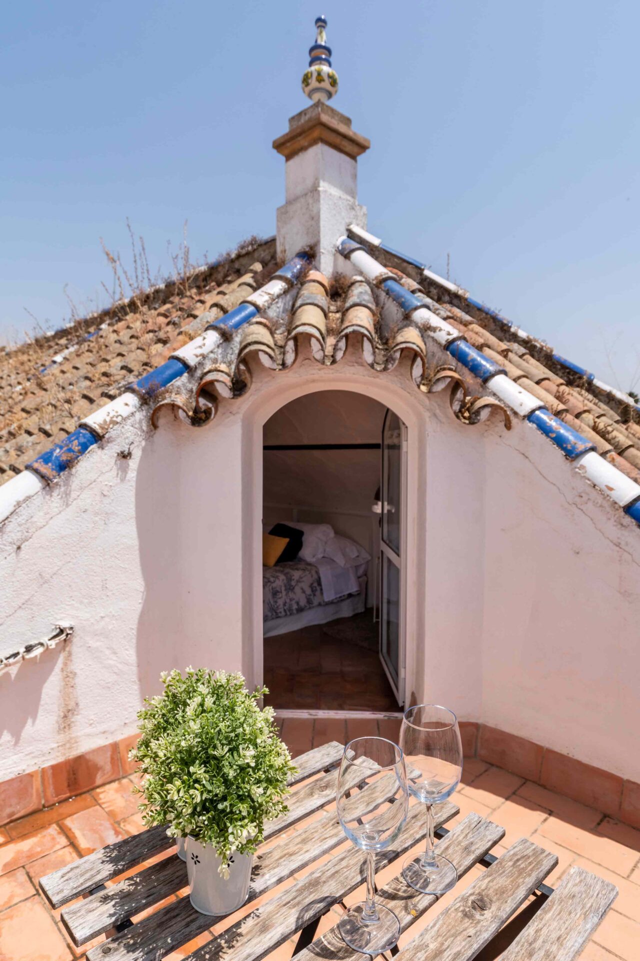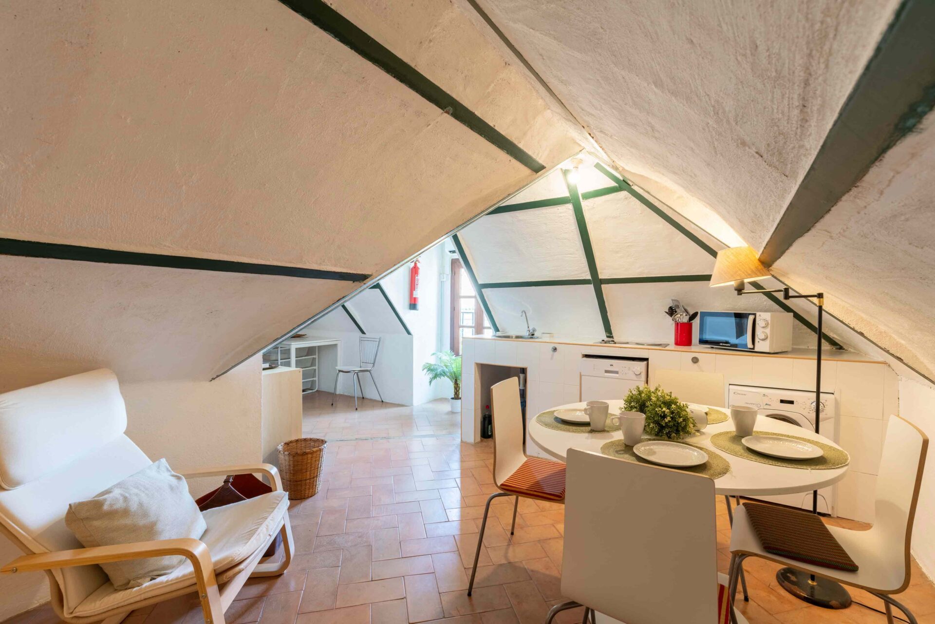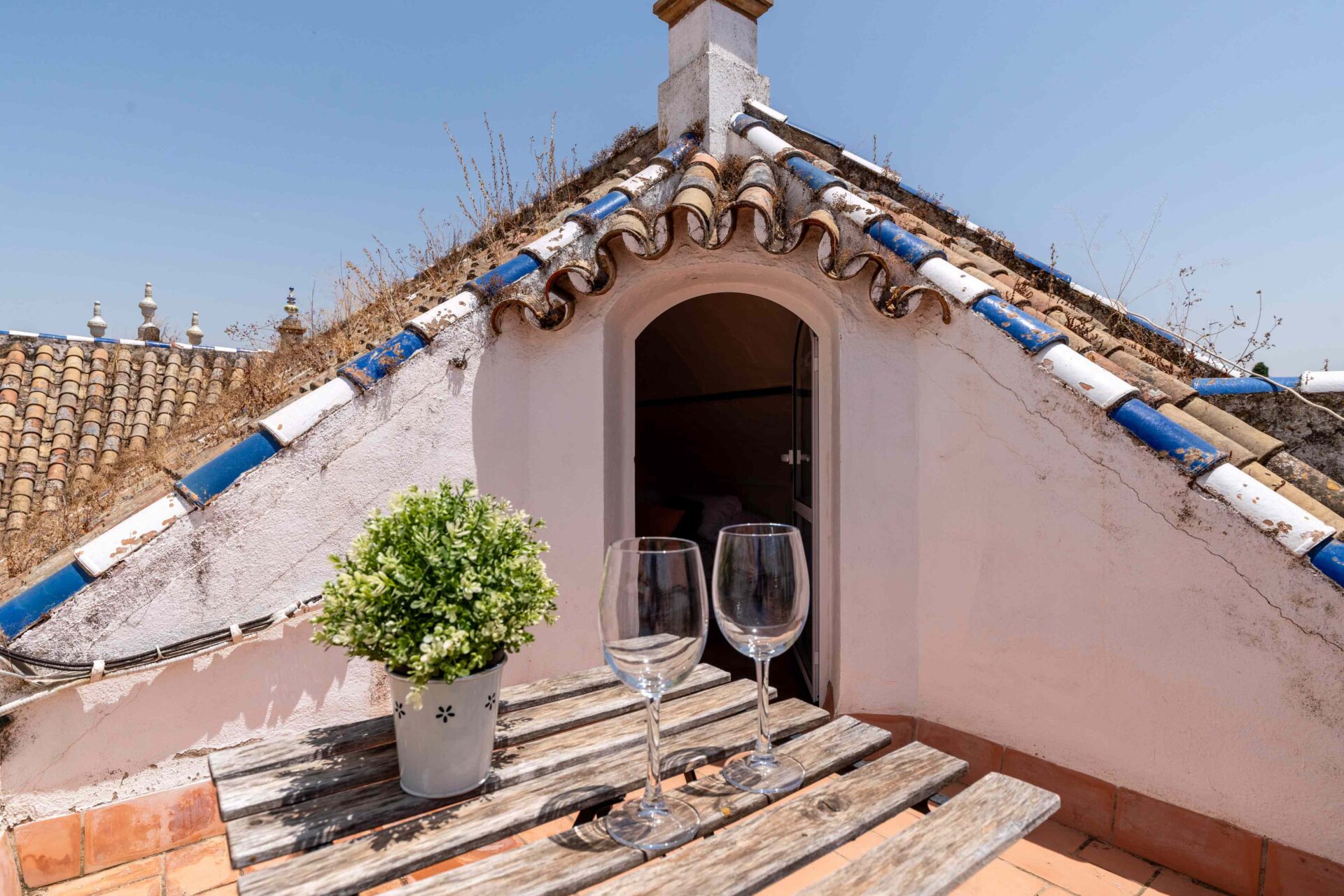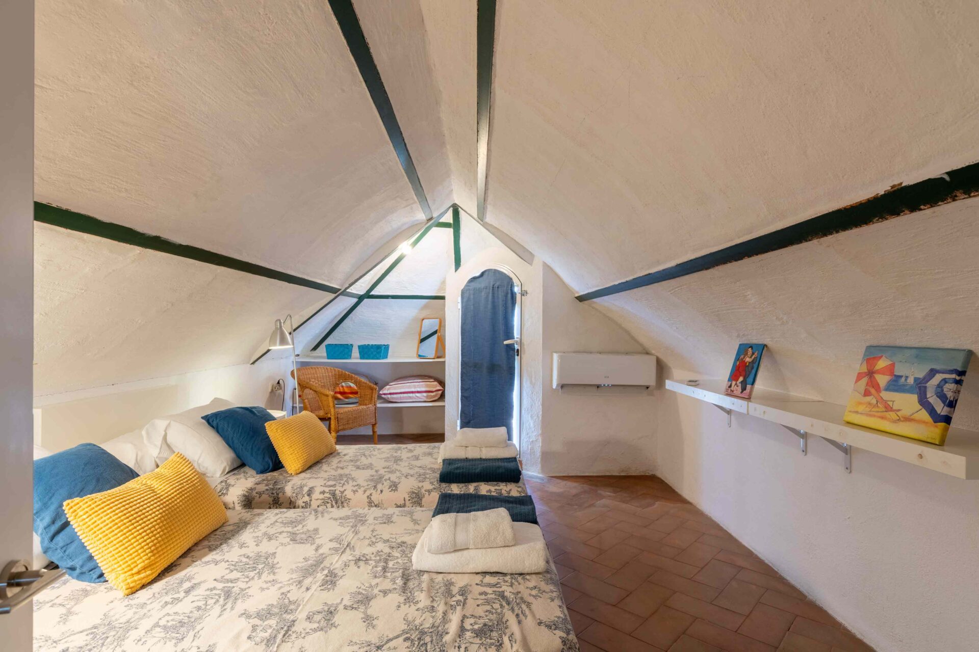 Tras subir por una escalera de piedra de caracol, se llega primero a una gran terraza mirando al jardín y piscina. A continuación al salón que tiene a un lado un baño con ducha y enfrente la buhardilla con una pequeña cocina, pequeña zona de estar y el dormitorio con dos camas individuales donde hay otra terraza mirando a la Catedral. A continuación por la escalera subimos a la habitación principal con baño en suite y unas vistas maravillosas. Si seguimos subiendo, llegamos a la azotea desde donde se ve todo el barrio Santa Cruz, sus increíbles vistas y la Catedral.