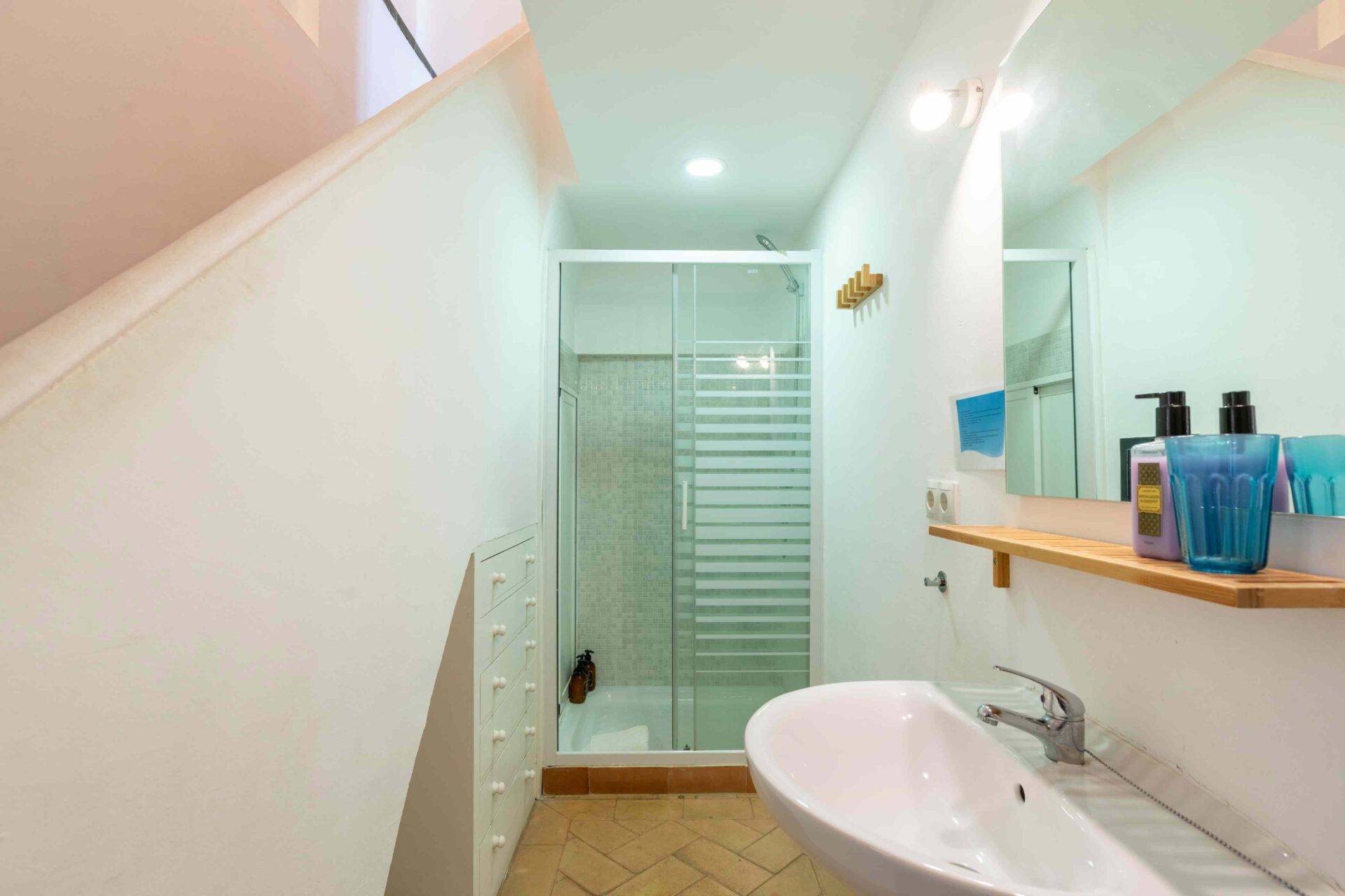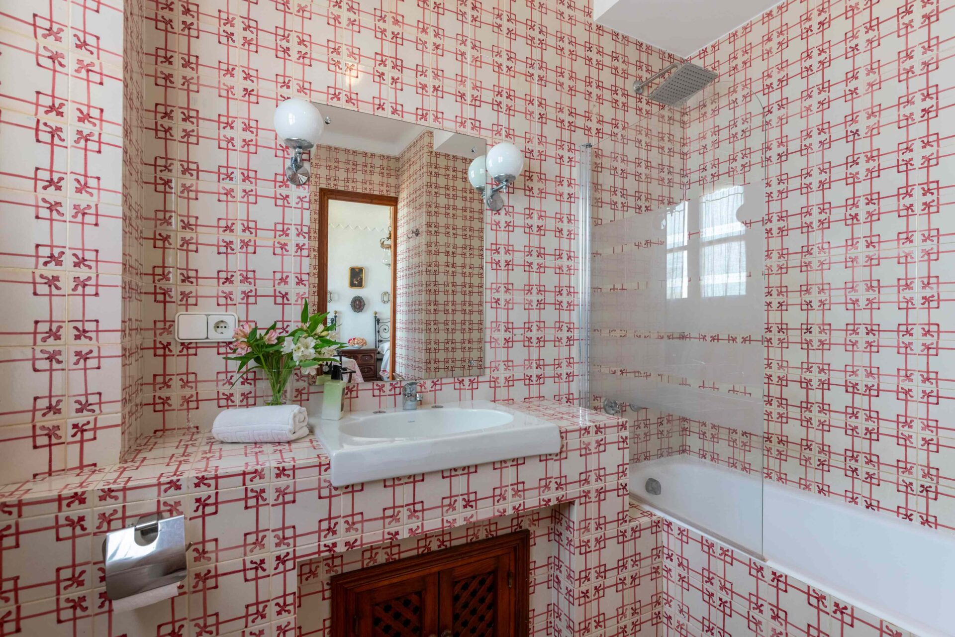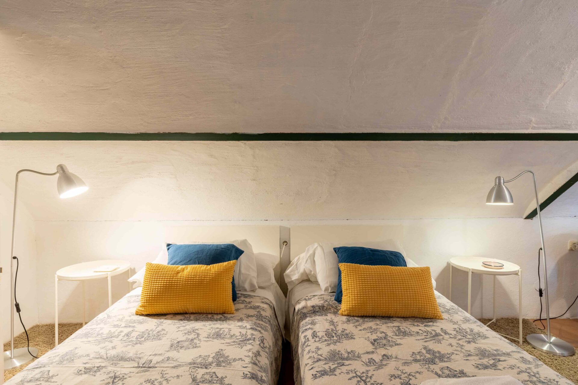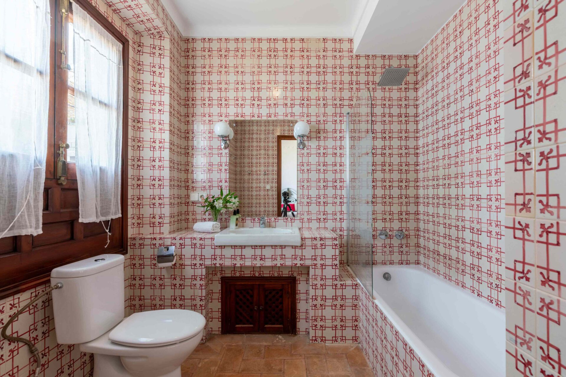 Tras subir por una escalera de piedra de caracol, se llega primero a una gran terraza mirando al jardín y piscina. A continuación al salón que tiene a un lado un baño con ducha y enfrente la buhardilla con una pequeña cocina, pequeña zona de estar y el dormitorio con dos camas individuales donde hay otra terraza mirando a la Catedral. A continuación por la escalera subimos a la habitación principal con baño en suite y unas vistas maravillosas. Si seguimos subiendo, llegamos a la azotea desde donde se ve todo el barrio Santa Cruz, sus increíbles vistas y la Catedral.