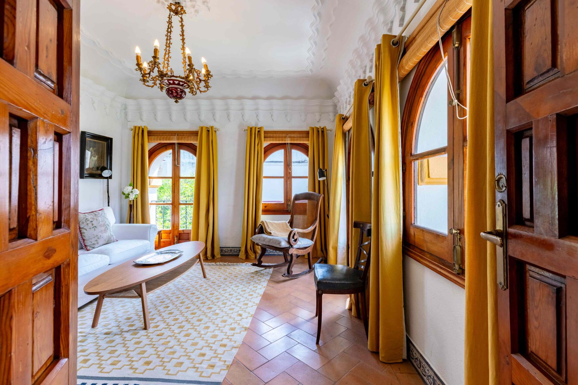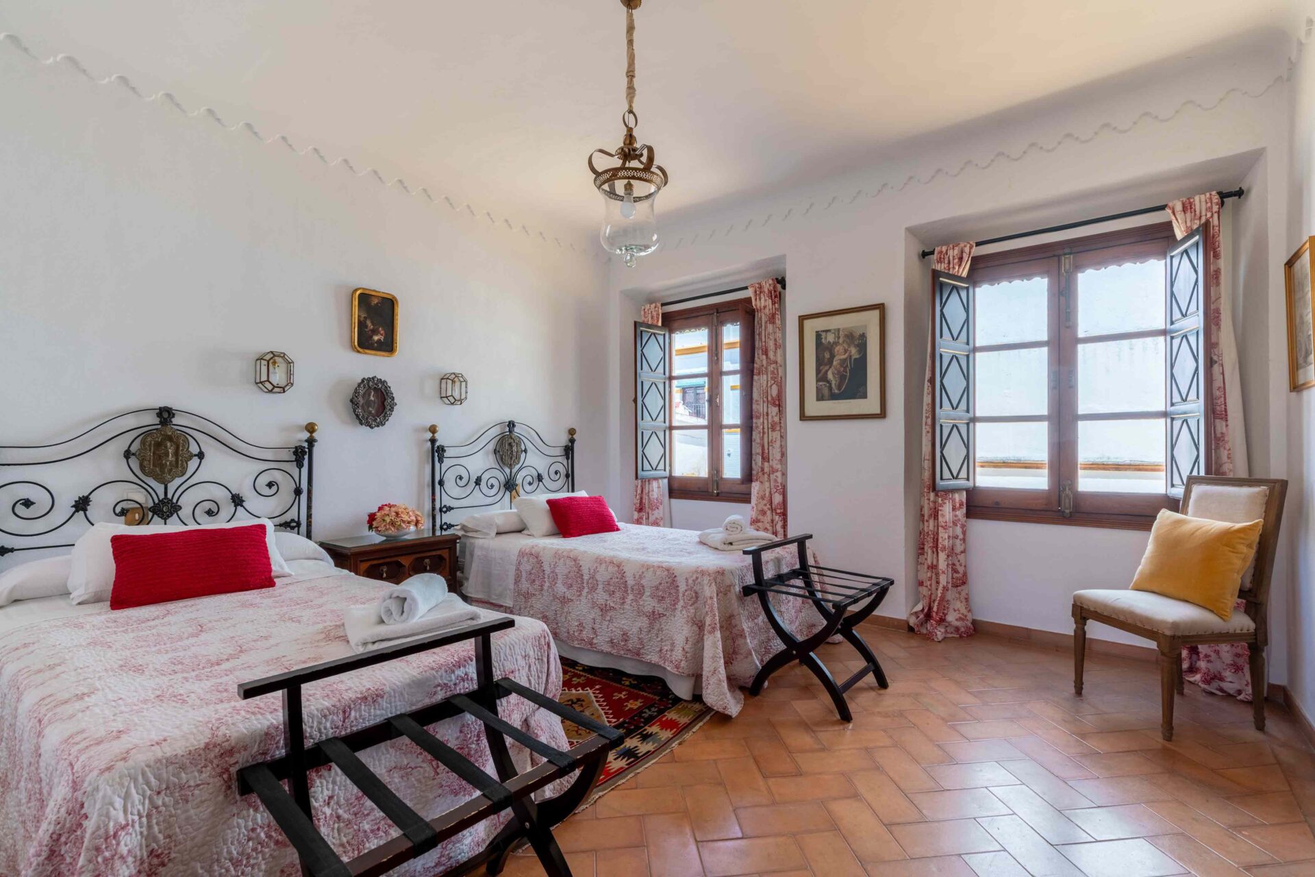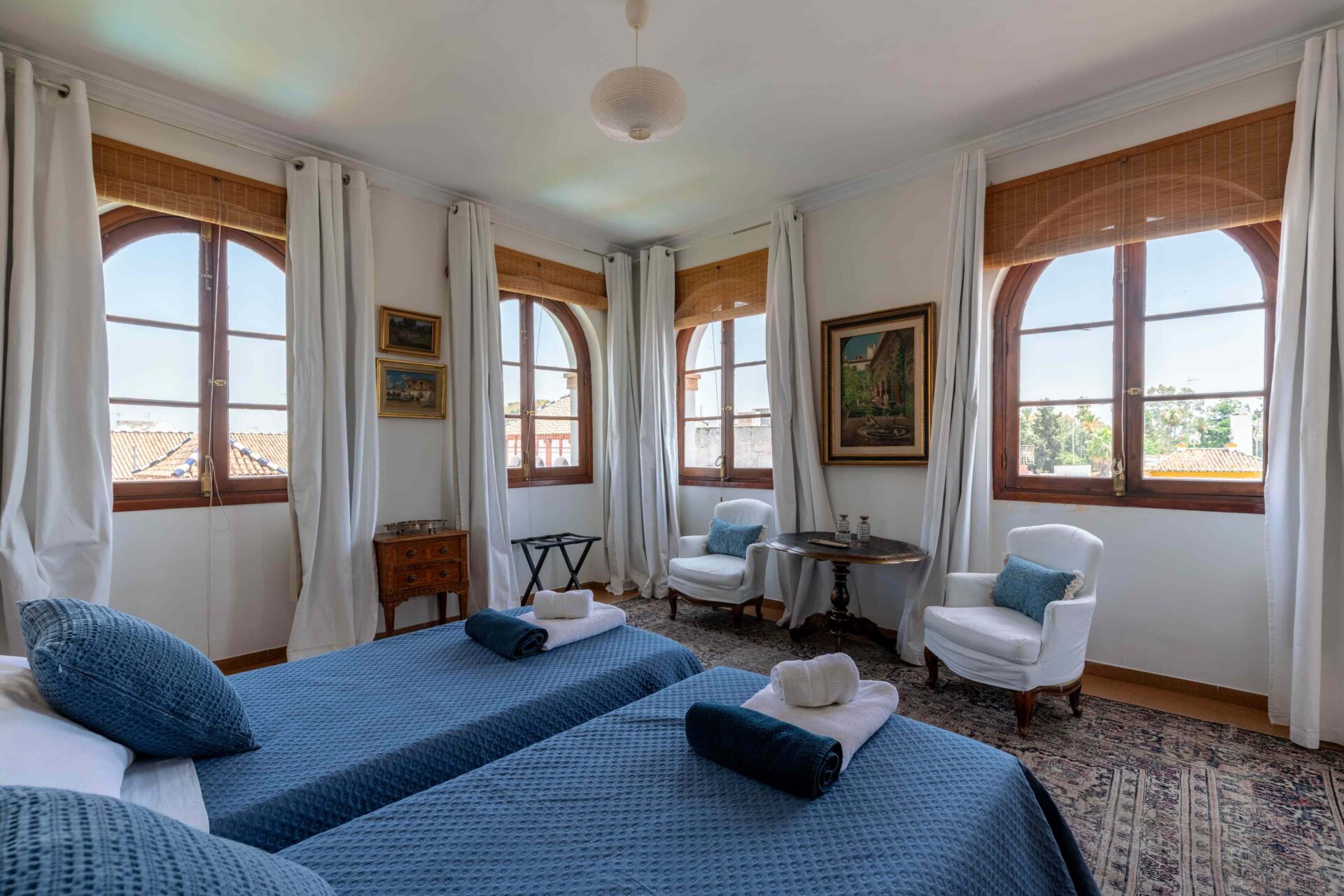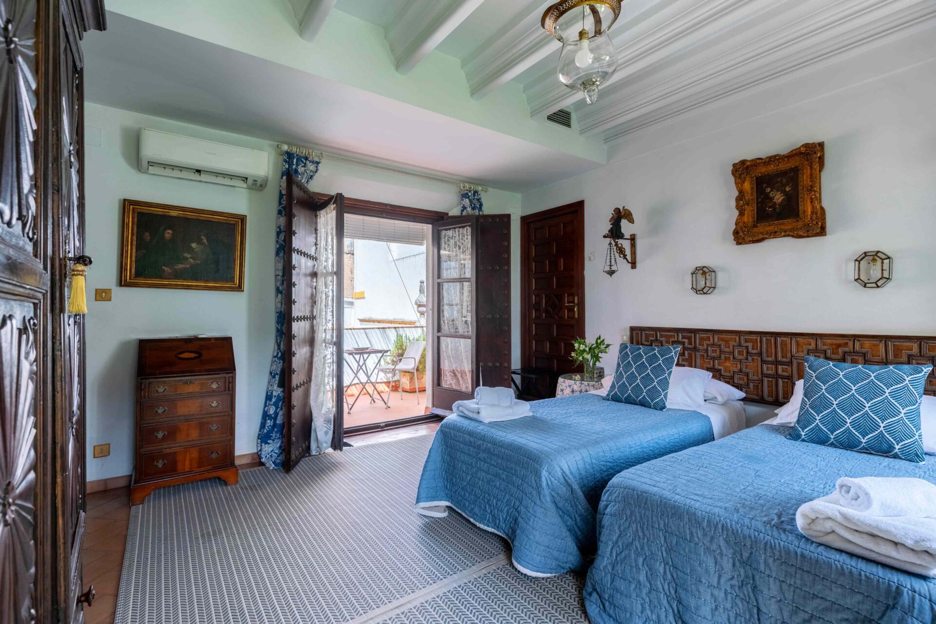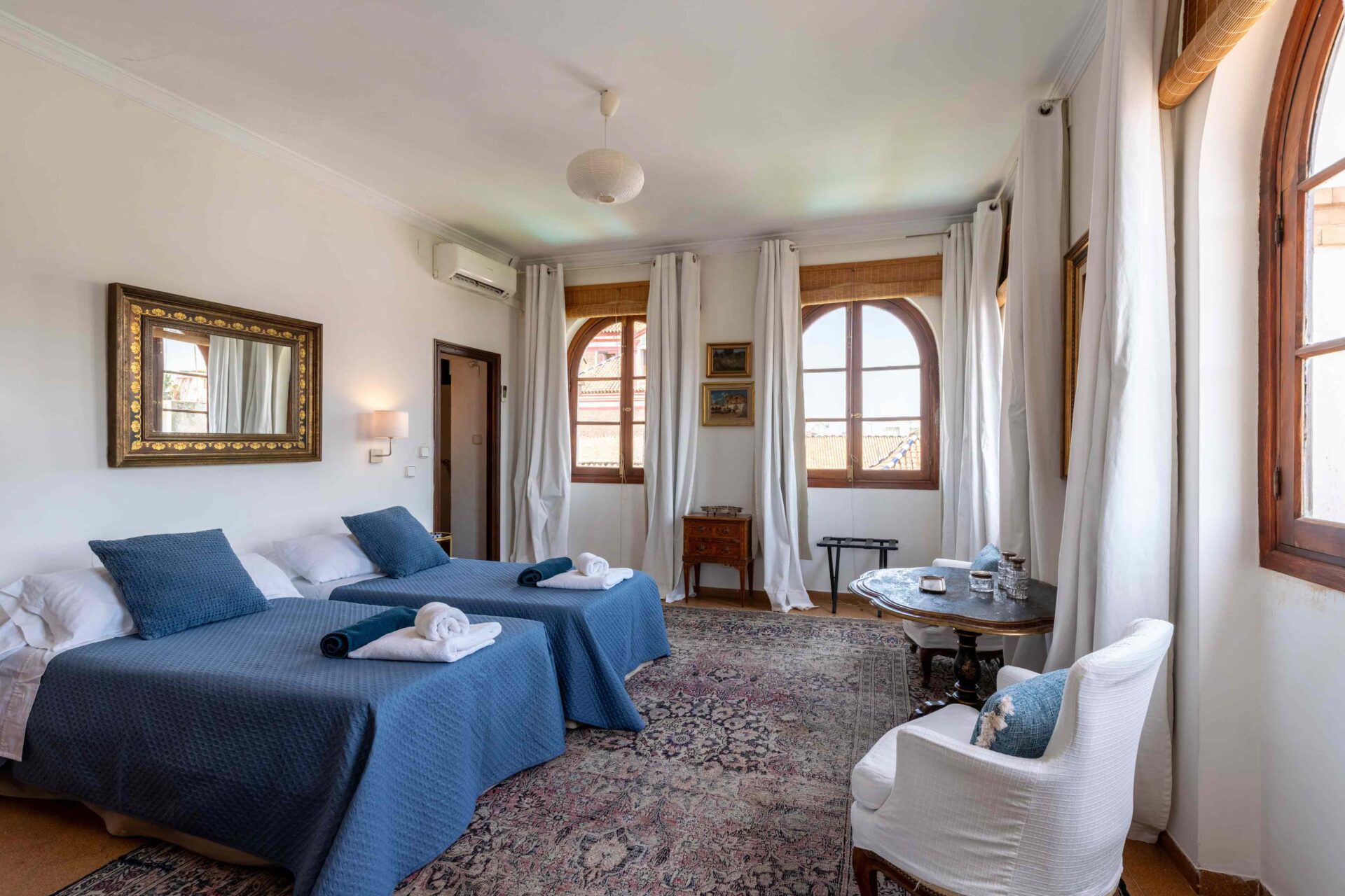 También aquí se encuentra la pequeña habitación para una persona con su baño y ducha en suite. Decorada con muebles antiguos y techos y molduras bellísimos así como sus cuadros. Con grandes balcones dando a la Plaza de Doña Elvira. Subimos por la escalera a la segunda planta donde se encuentran los tres dormitorios dobles con sus baños y el pequeño cuarto de estar donde esta el sofa cama. Los ventanales del pasillo dan a la Plaza con una luz increíble.