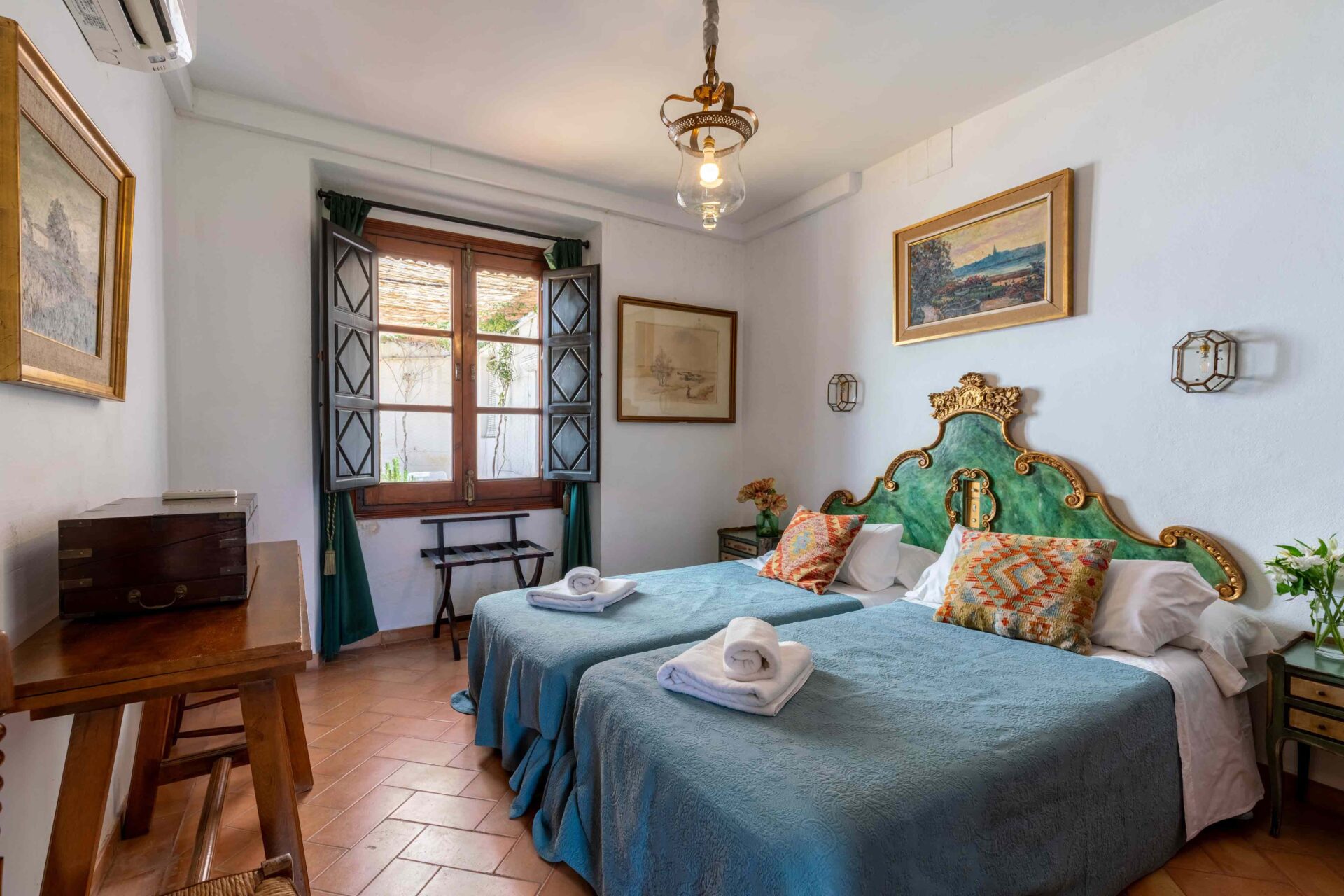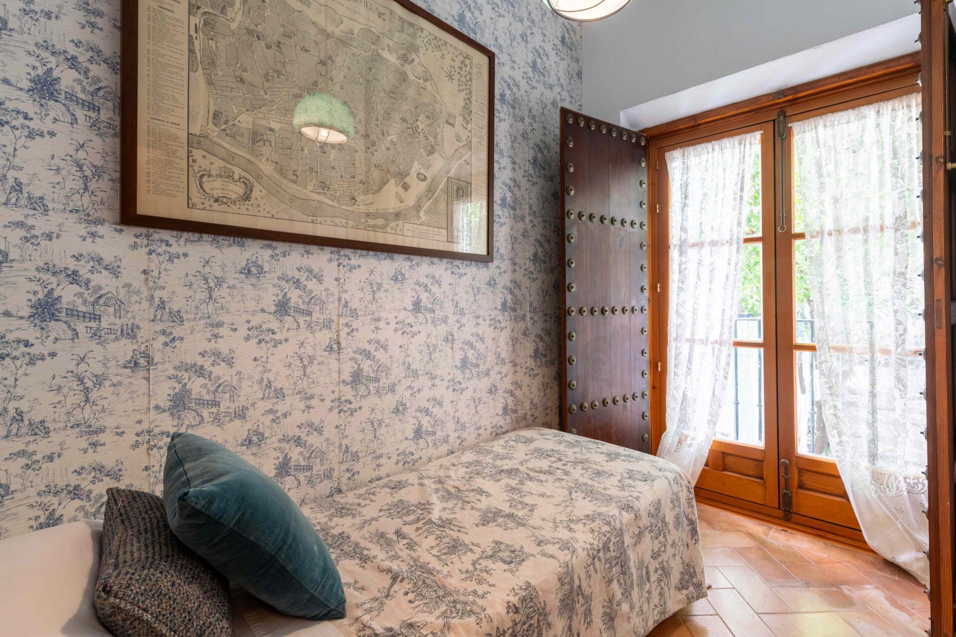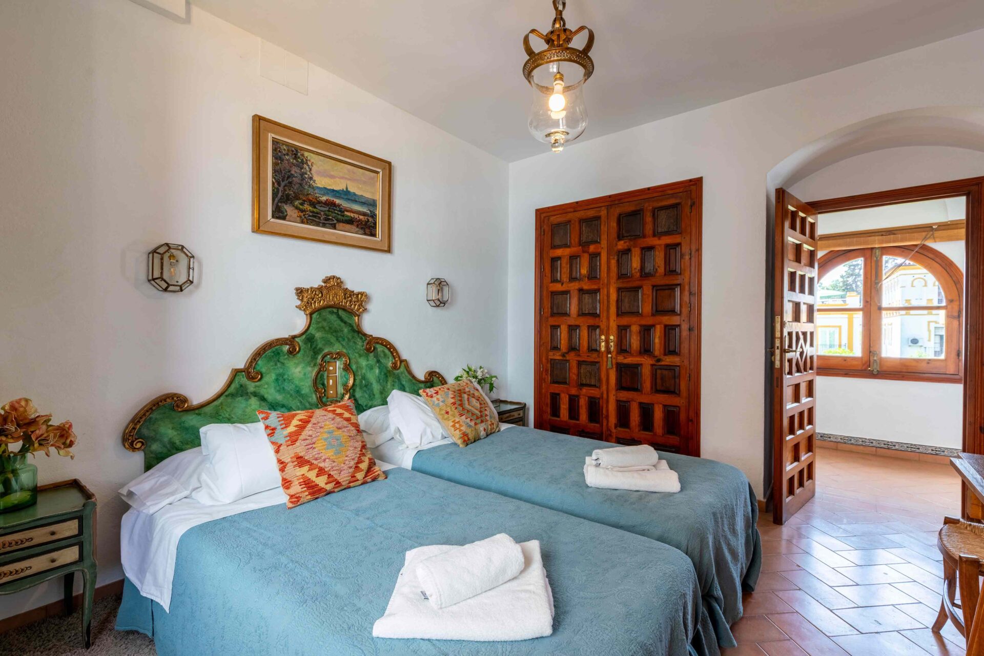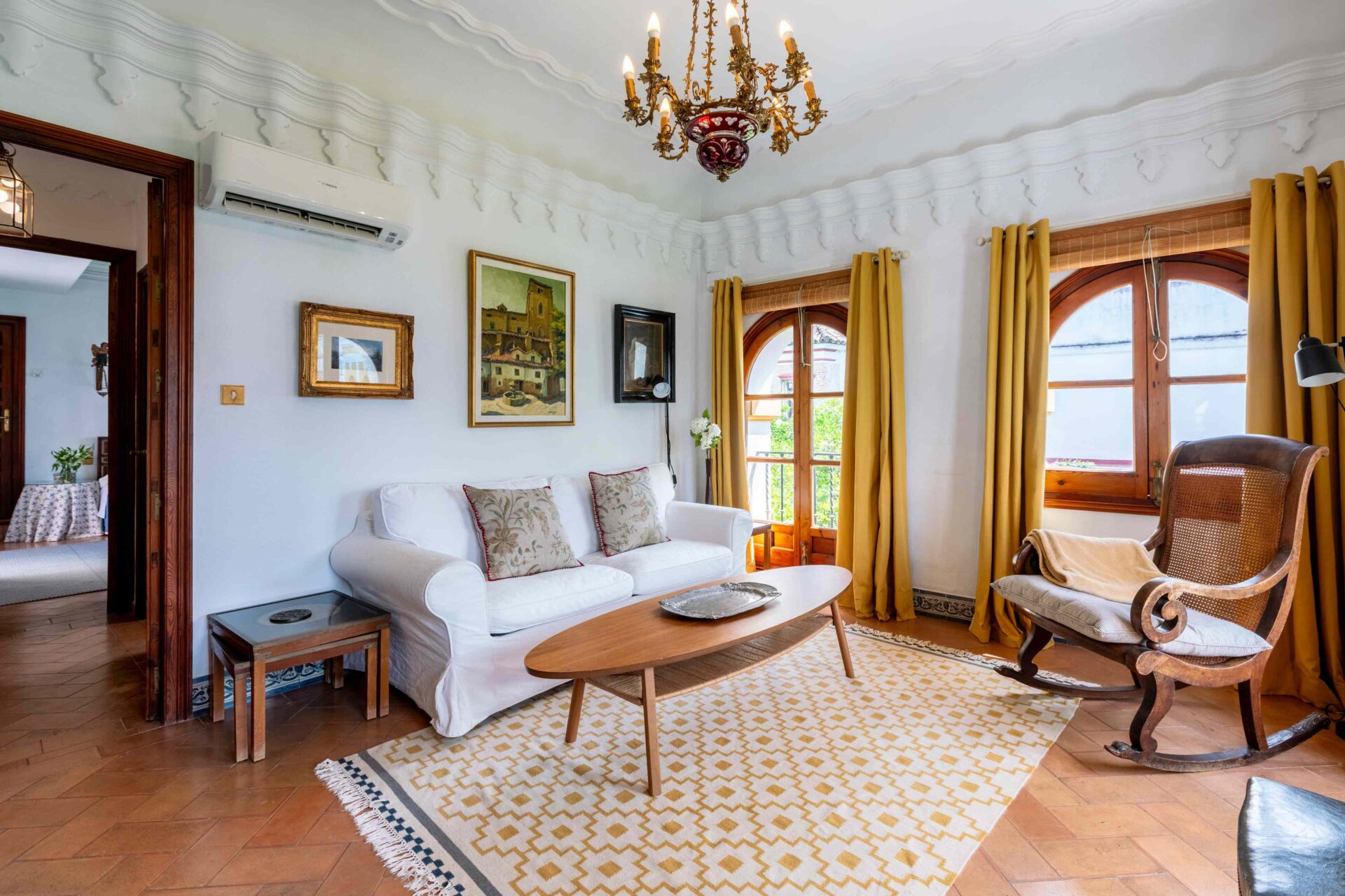 También aquí se encuentra la pequeña habitación para una persona con su baño y ducha en suite. Decorada con muebles antiguos y techos y molduras bellísimos así como sus cuadros. Con grandes balcones dando a la Plaza de Doña Elvira. Subimos por la escalera a la segunda planta donde se encuentran los tres dormitorios dobles con sus baños y el pequeño cuarto de estar donde esta el sofa cama. Los ventanales del pasillo dan a la Plaza con una luz increíble.