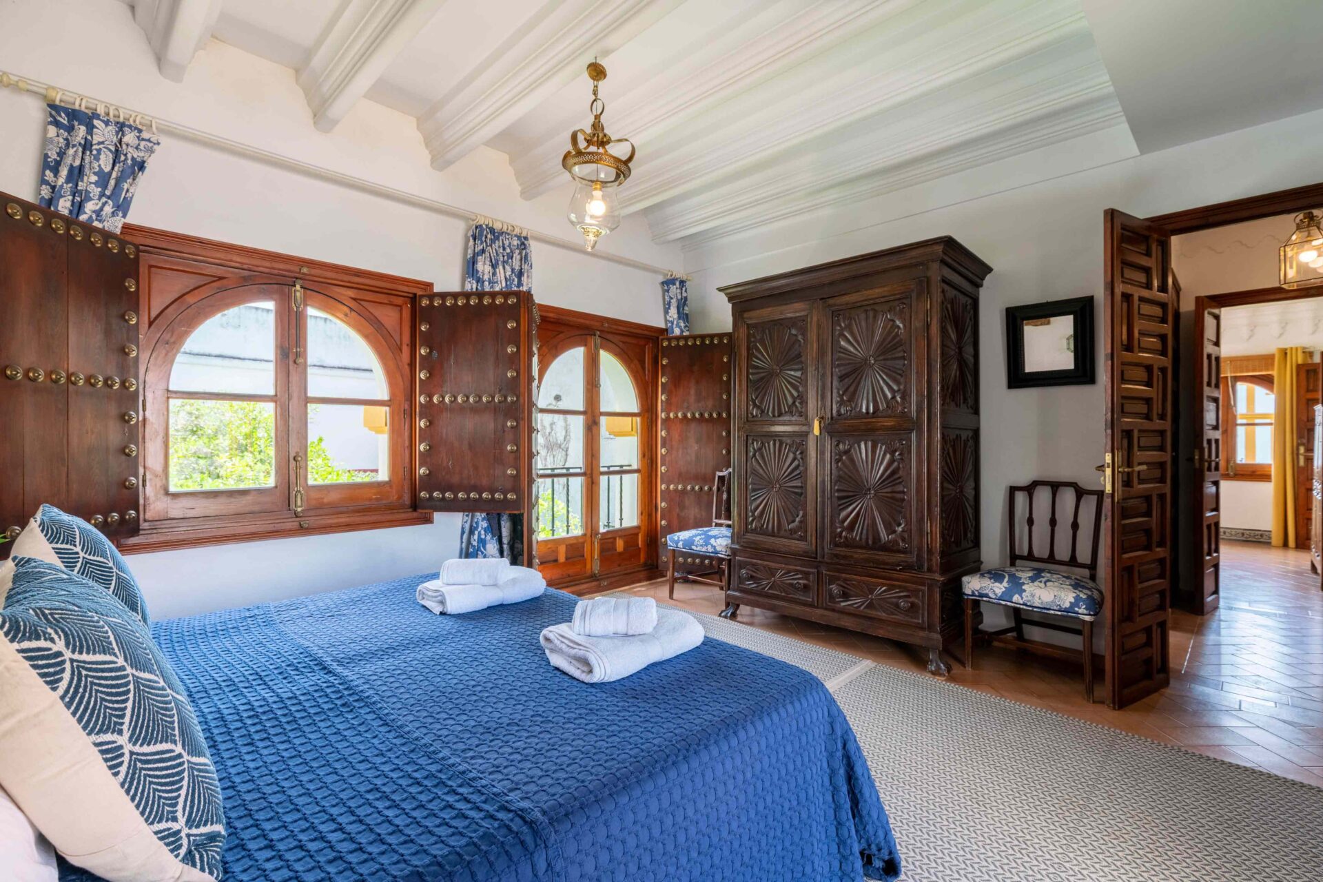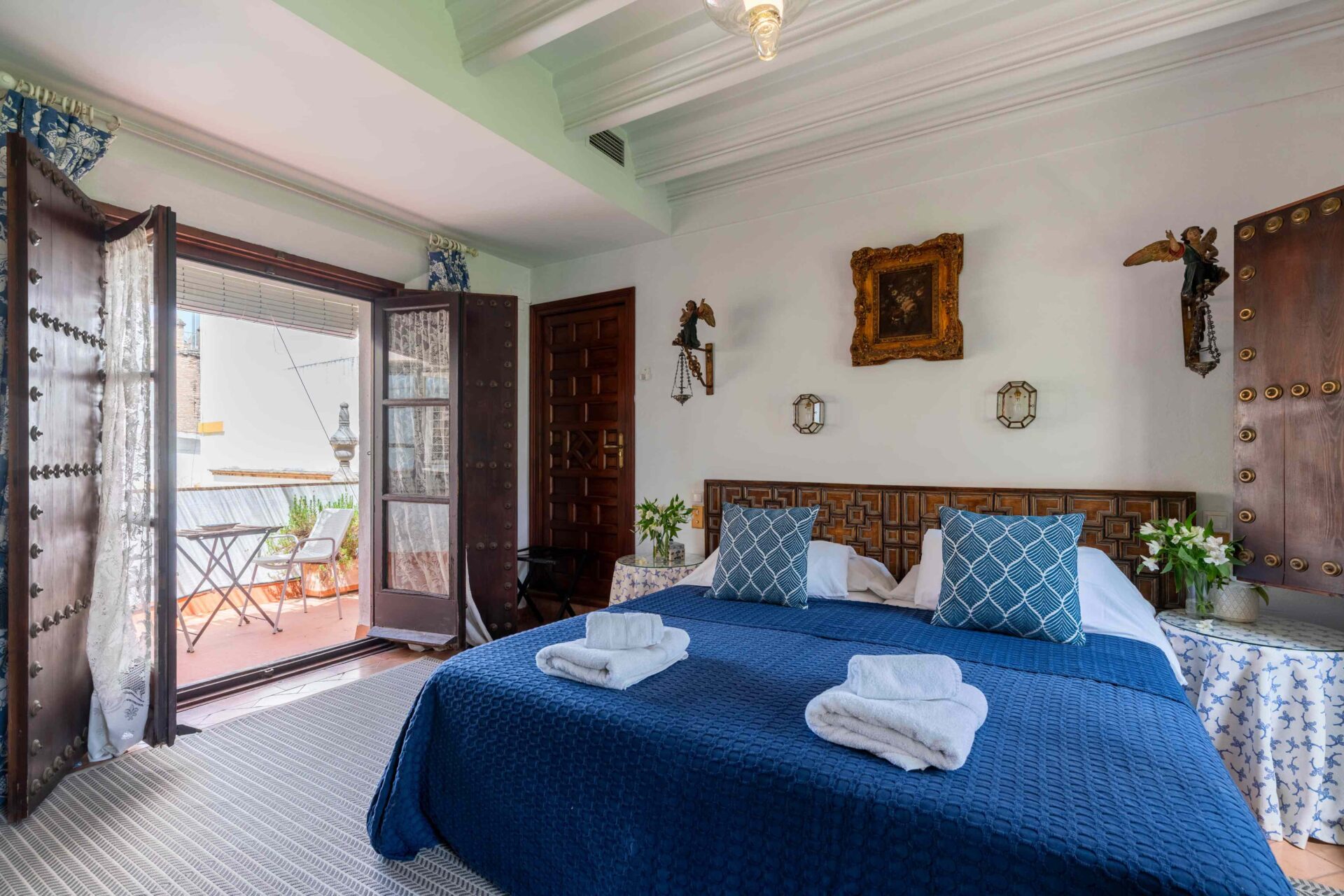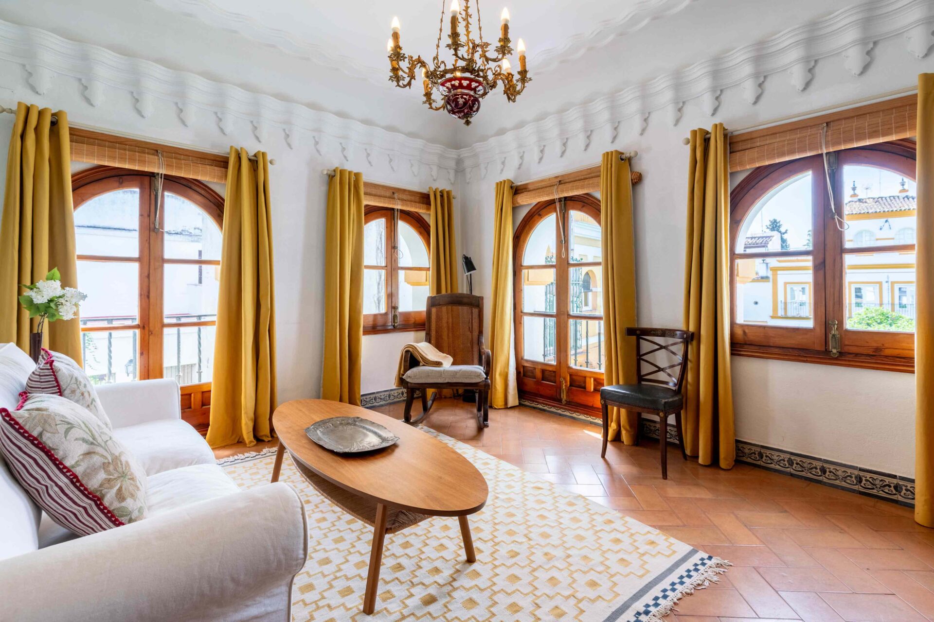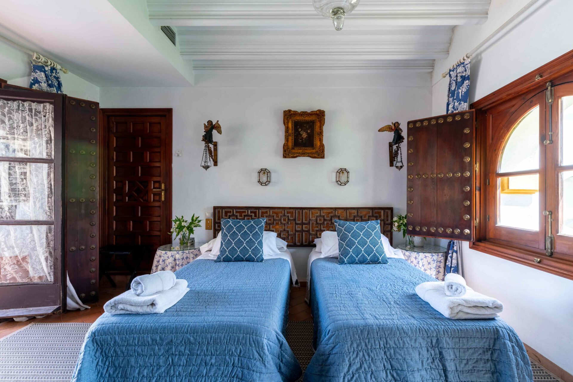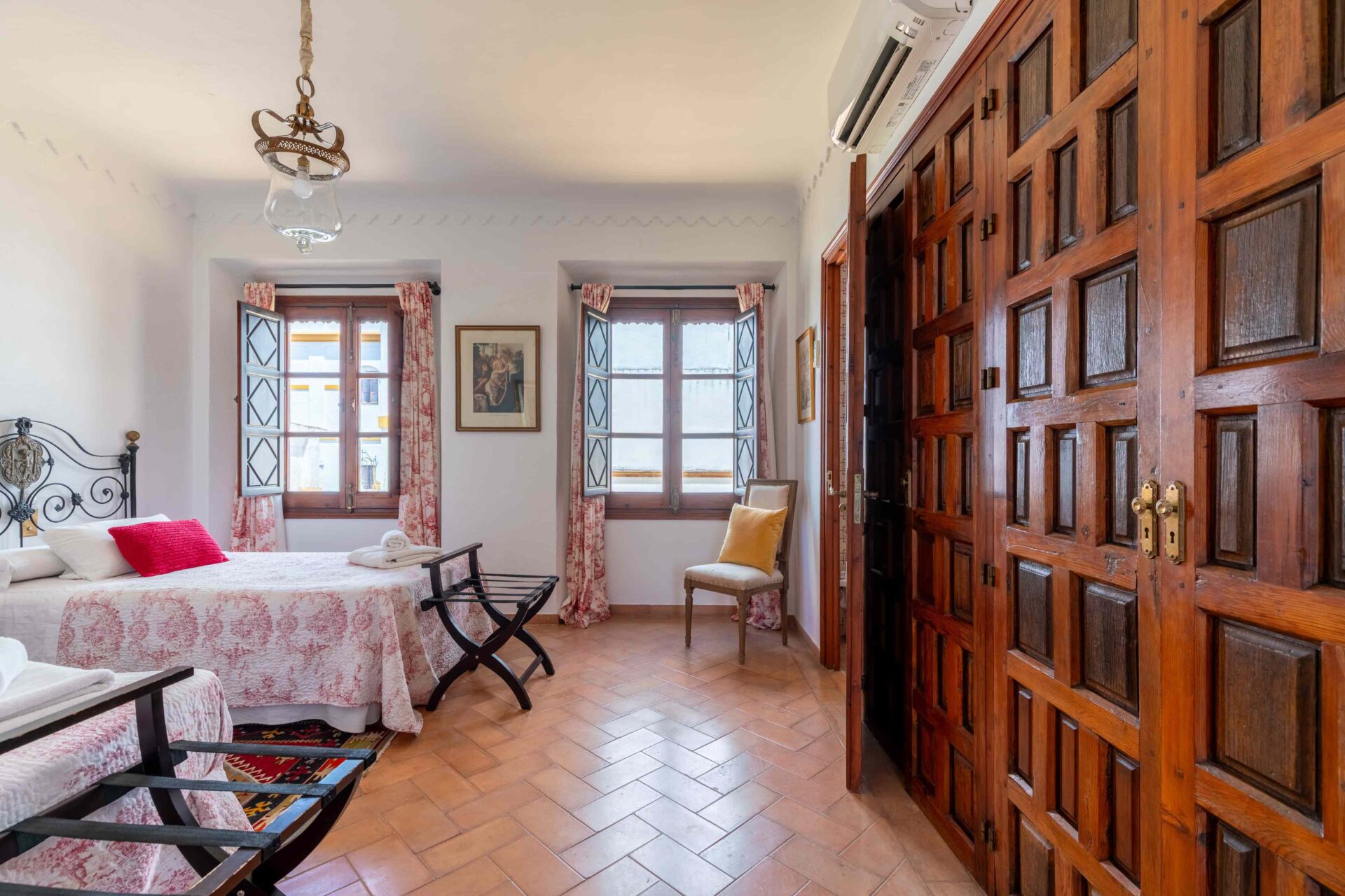 También aquí se encuentra la pequeña habitación para una persona con su baño y ducha en suite. Decorada con muebles antiguos y techos y molduras bellísimos así como sus cuadros. Con grandes balcones dando a la Plaza de Doña Elvira. Subimos por la escalera a la segunda planta donde se encuentran los tres dormitorios dobles con sus baños y el pequeño cuarto de estar donde esta el sofa cama. Los ventanales del pasillo dan a la Plaza con una luz increíble.
