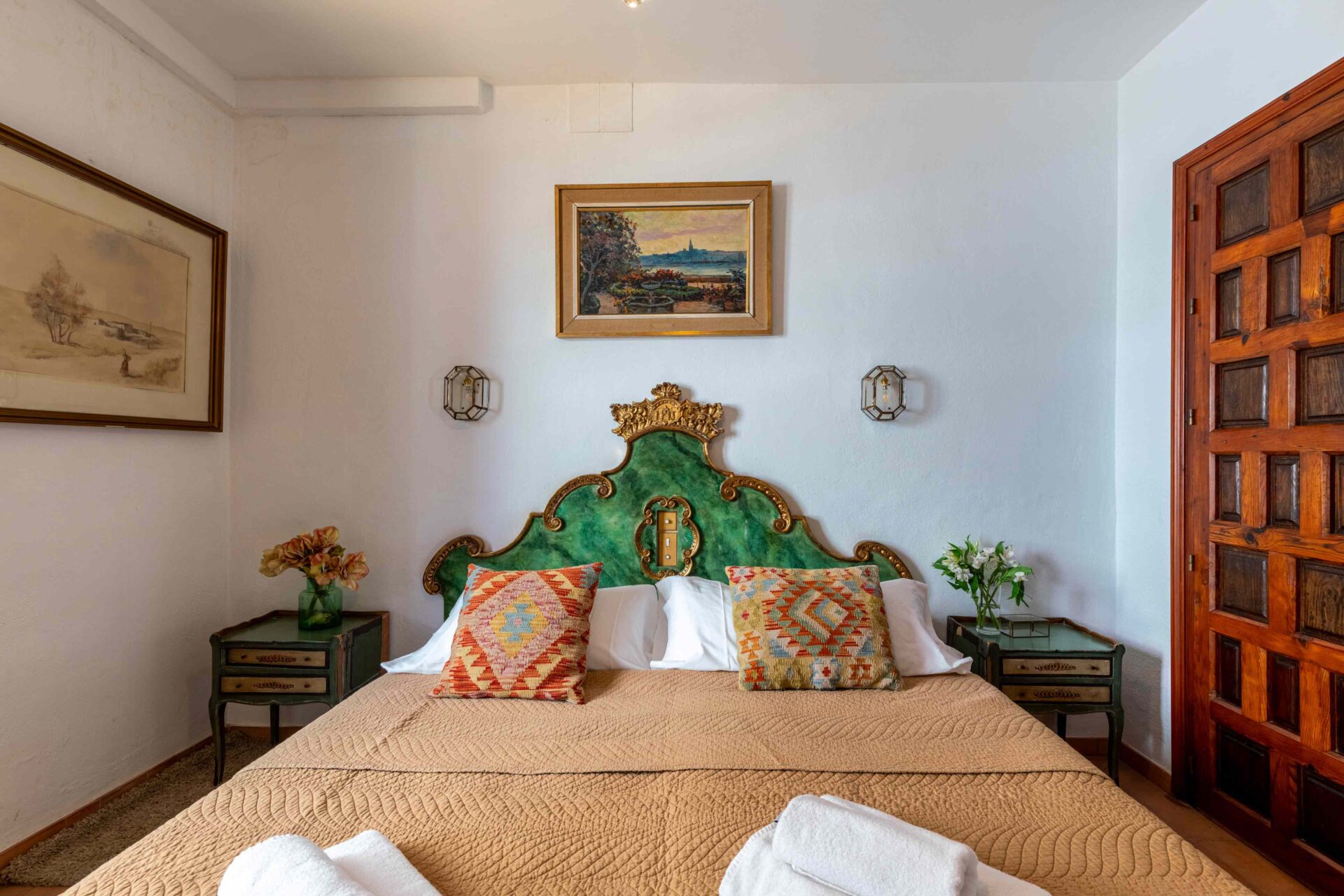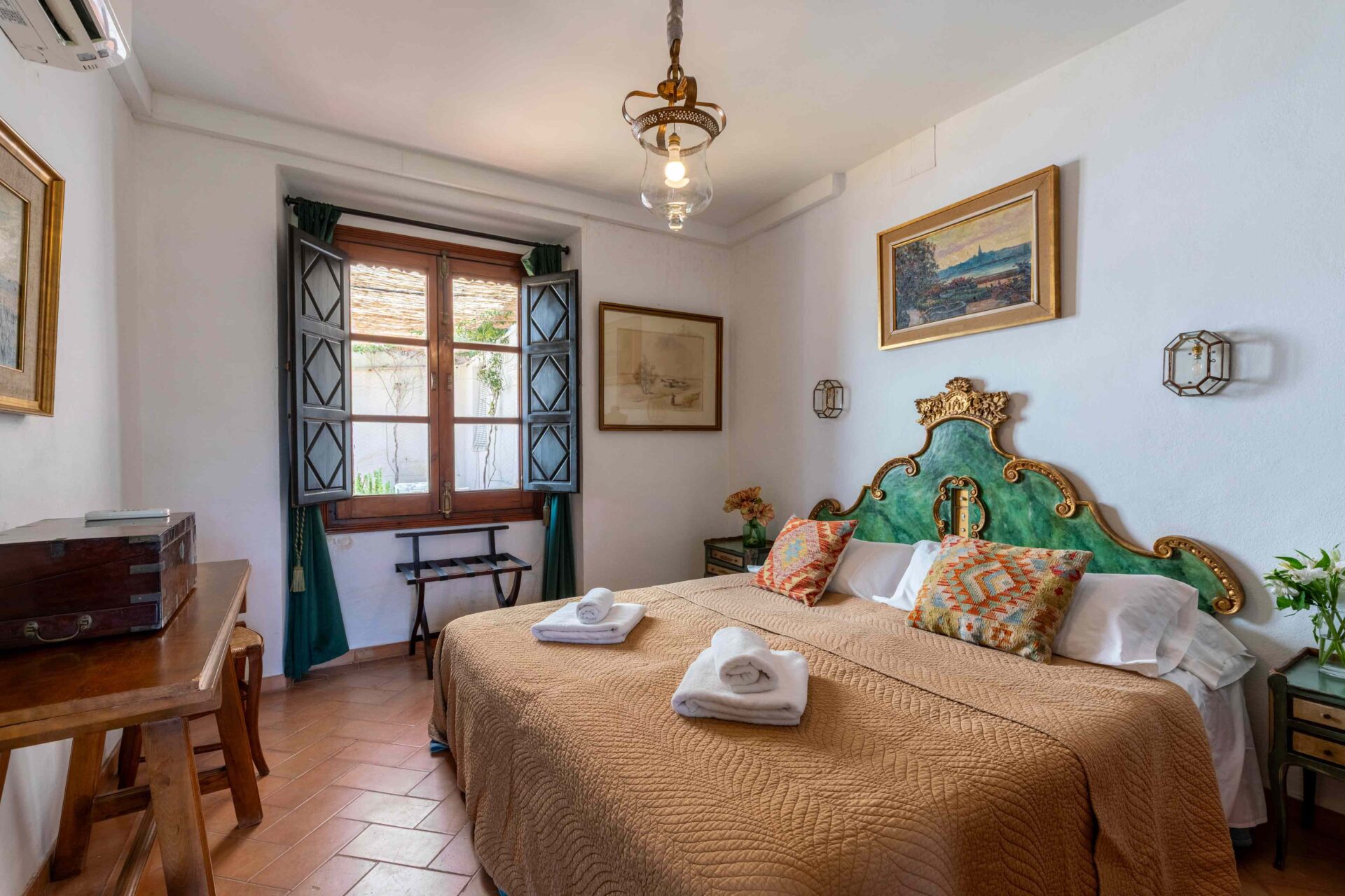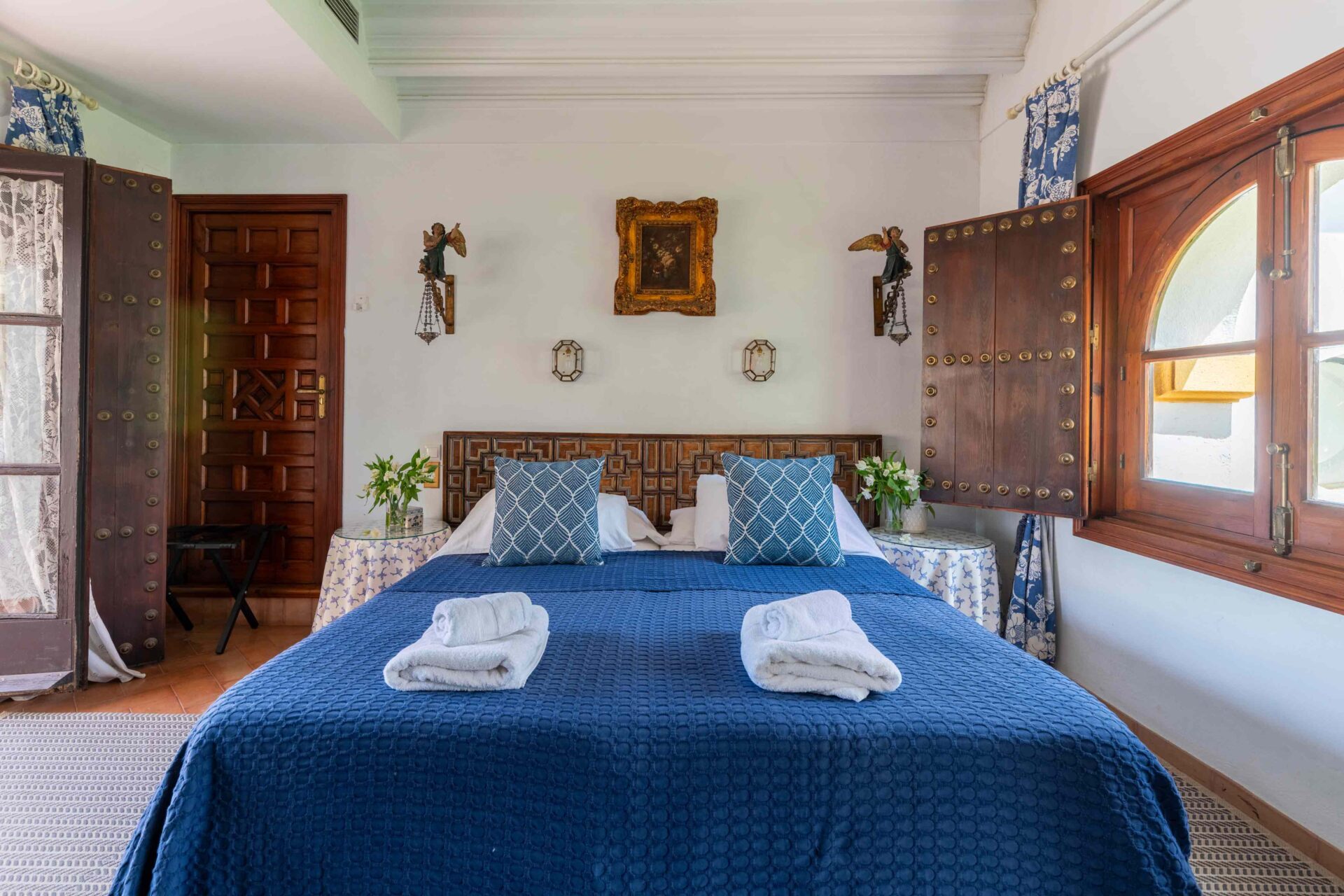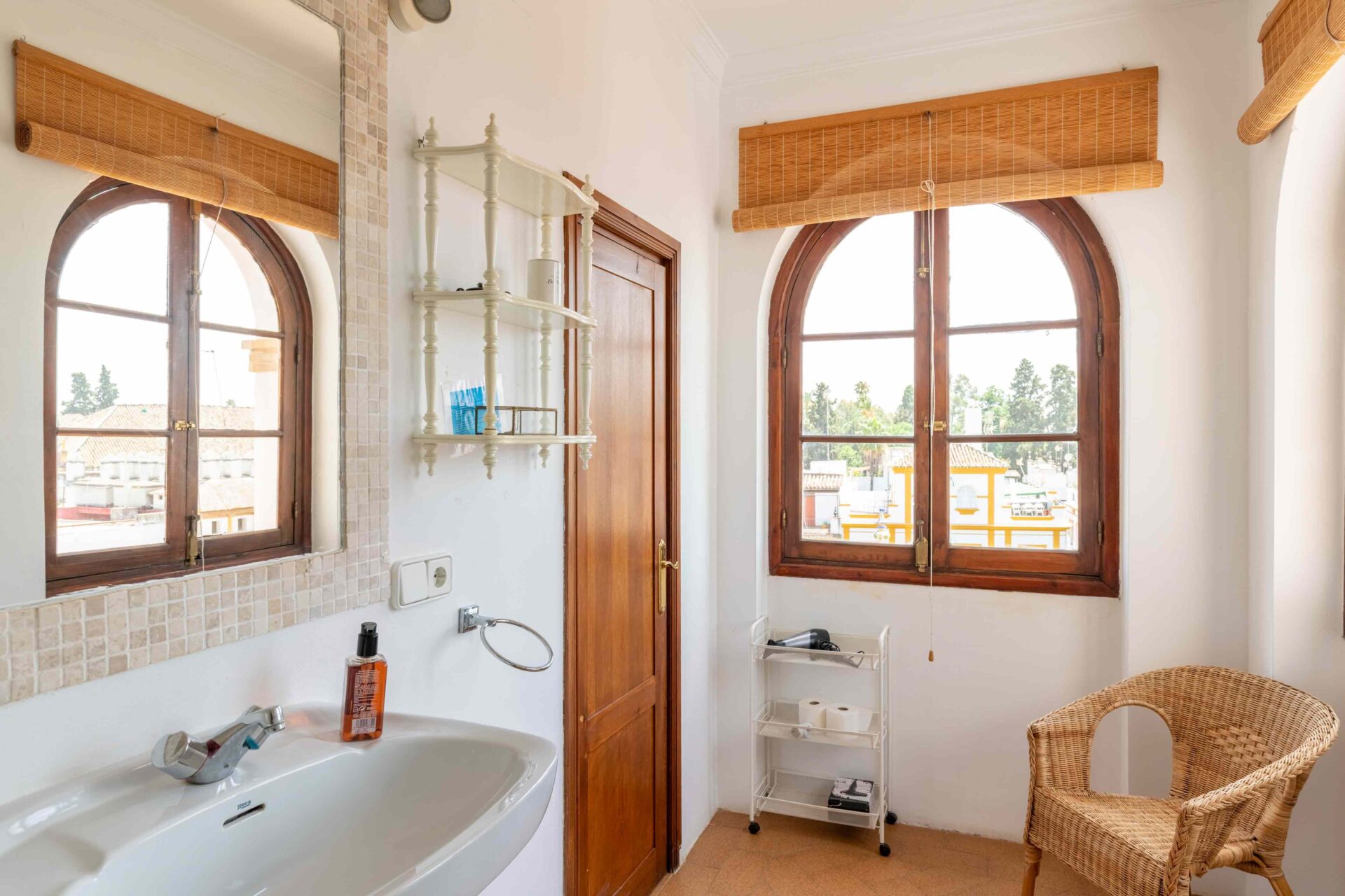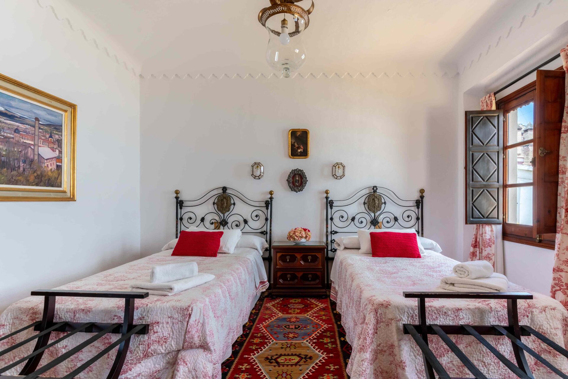 También aquí se encuentra la pequeña habitación para una persona con su baño y ducha en suite. Decorada con muebles antiguos y techos y molduras bellísimos así como sus cuadros. Con grandes balcones dando a la Plaza de Doña Elvira. Subimos por la escalera a la segunda planta donde se encuentran los tres dormitorios dobles con sus baños y el pequeño cuarto de estar donde esta el sofa cama. Los ventanales del pasillo dan a la Plaza con una luz increíble.