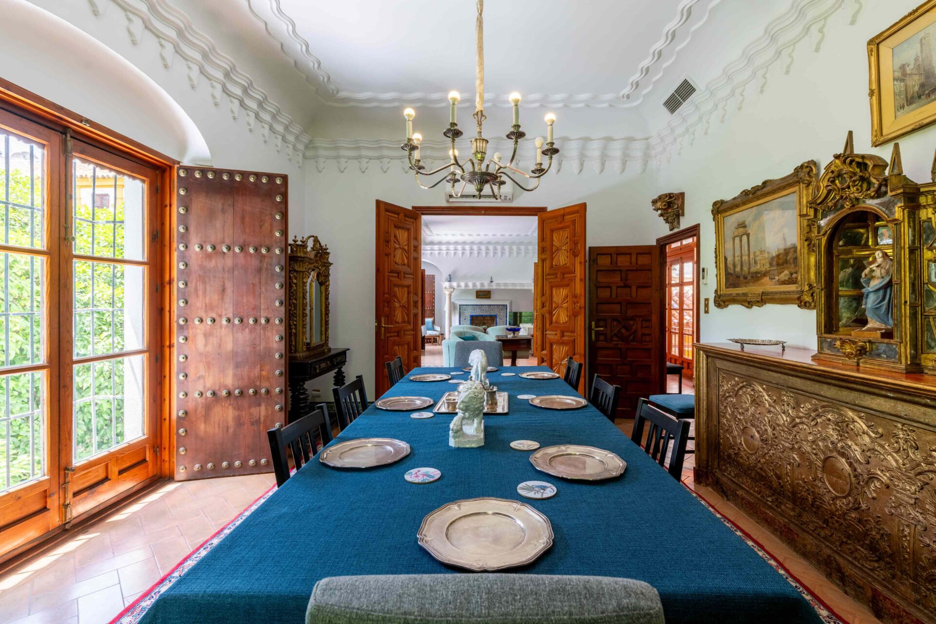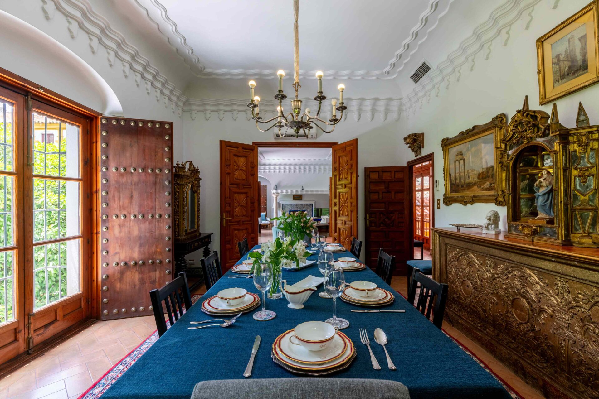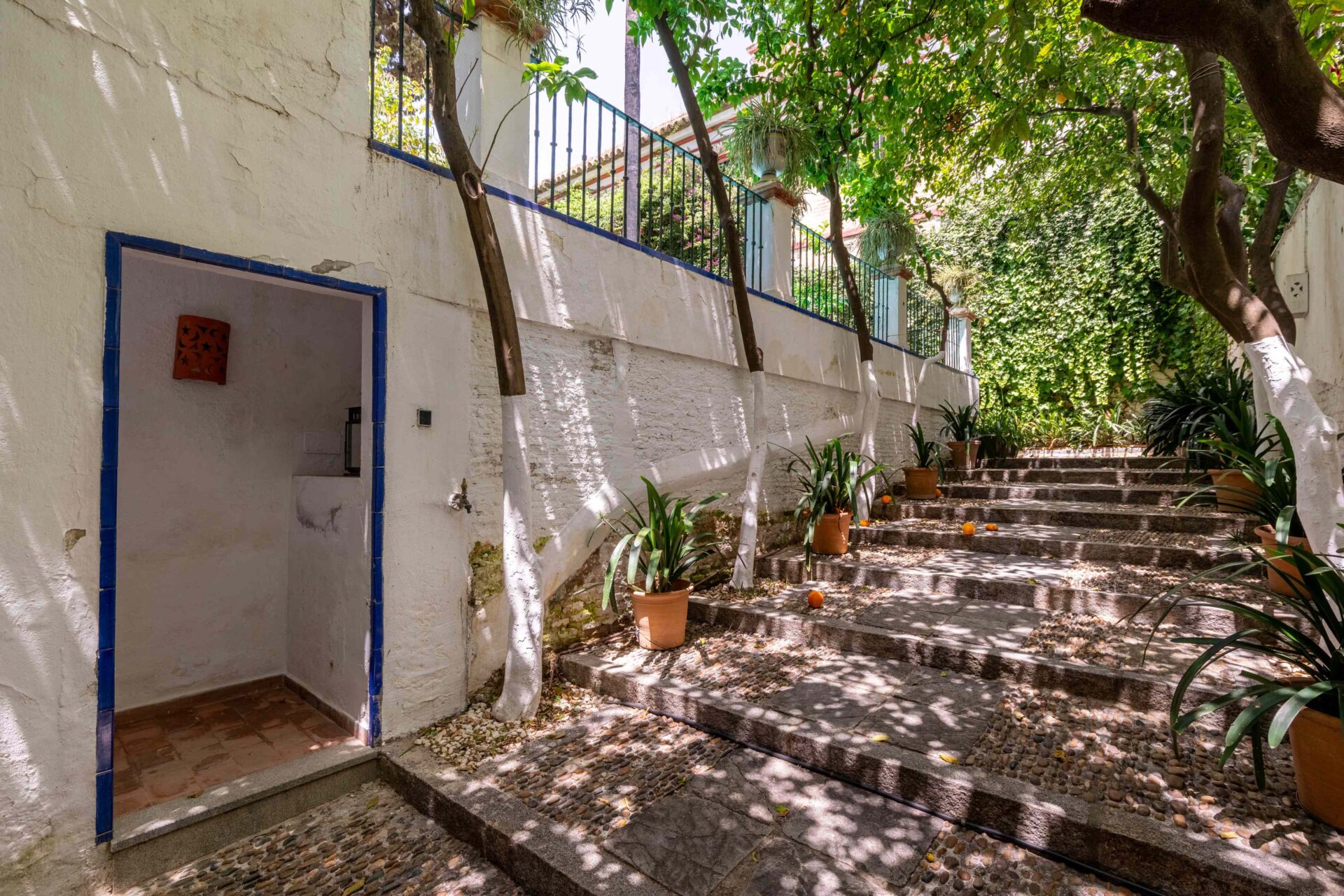 Se entra a la propiedad por una cancela de hierro desde la Plaza Doña Elvira. Se accede al jardín patio y piscina , y a continuación se llega a la puerta de entrada a la Casa Grande con su imponente escalera. Llegamos a la planta primera donde se encuentra la cocina, el comedor totalmente independiente y el gran salon.