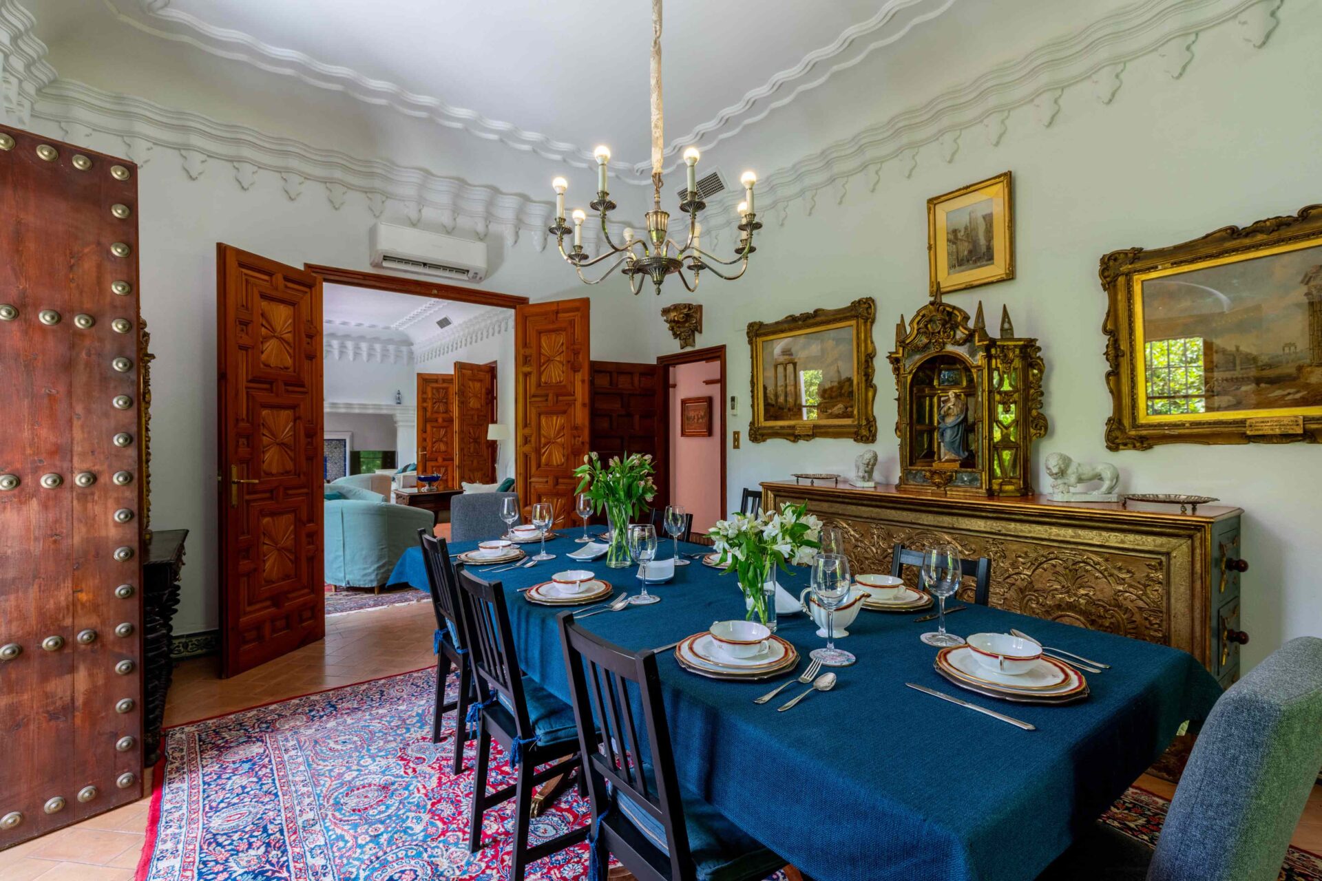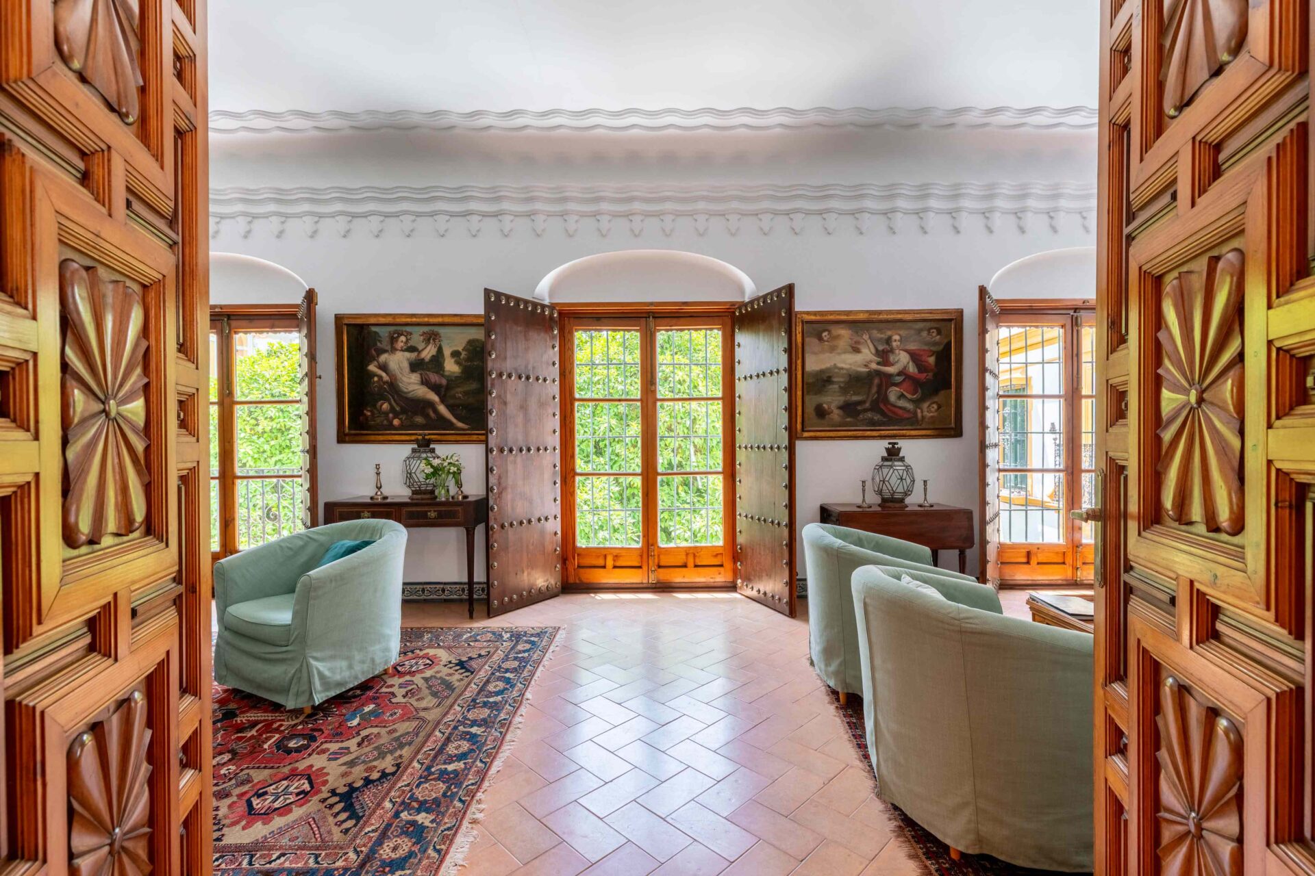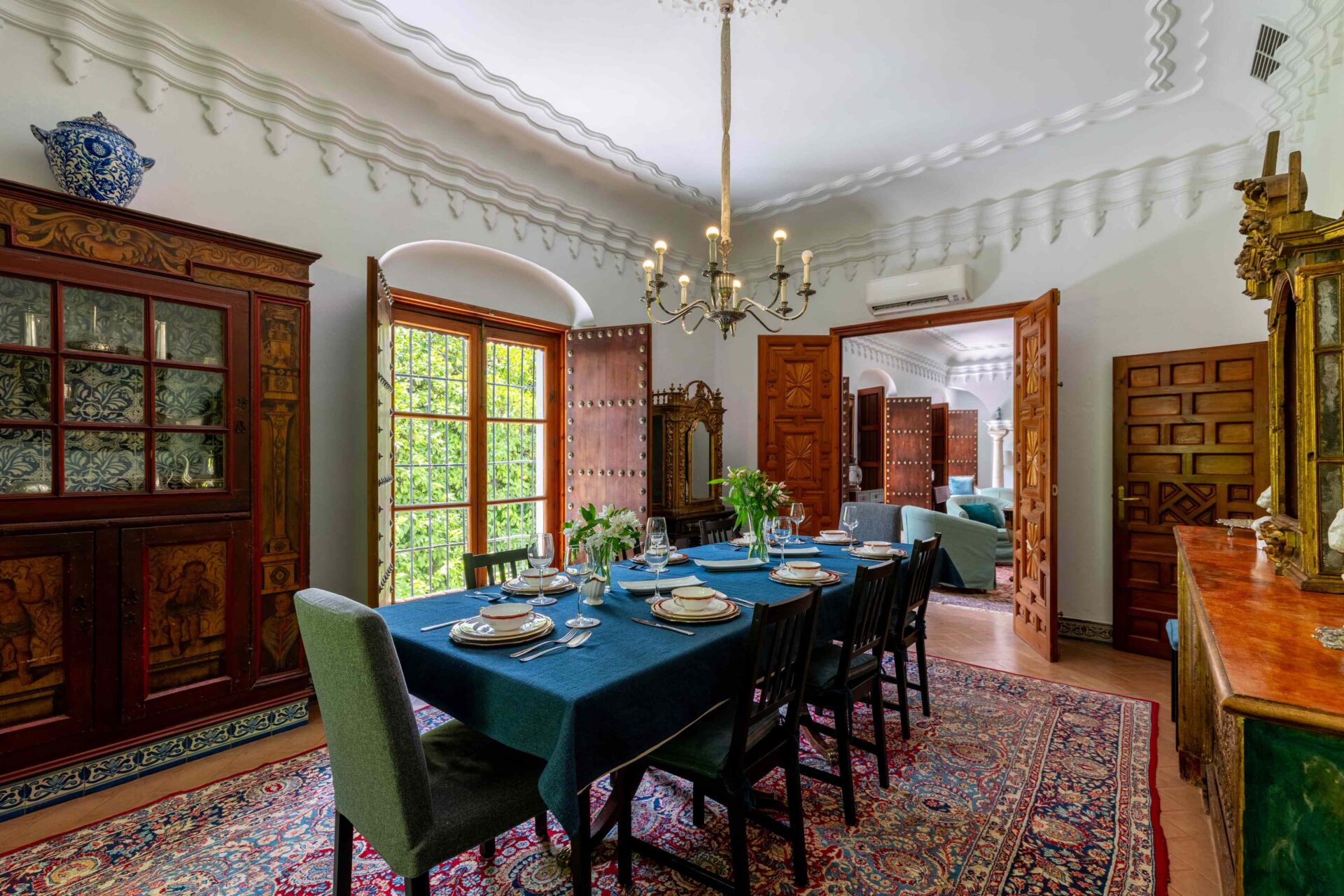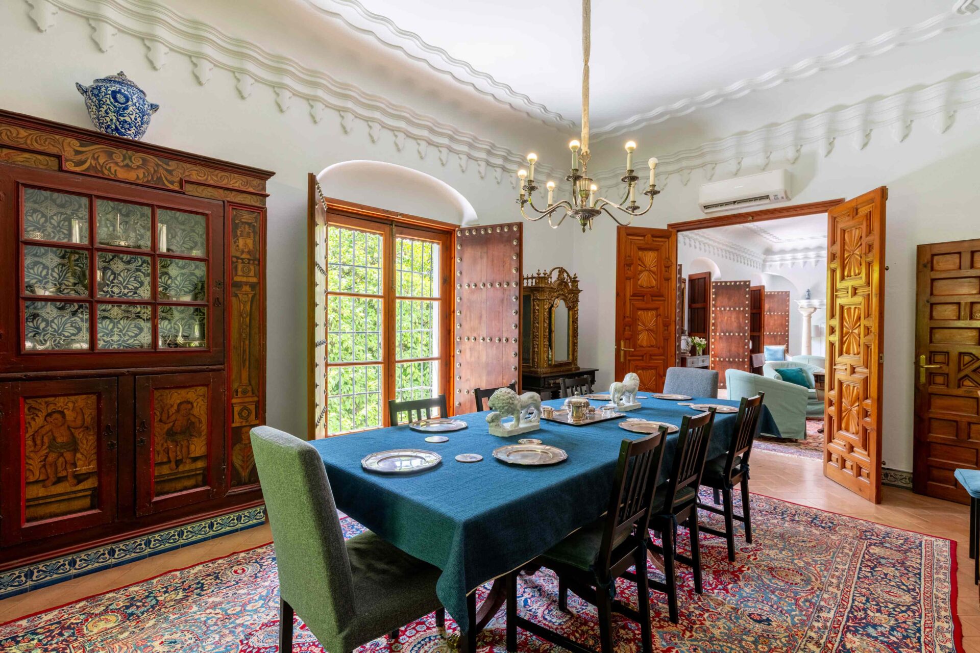 Se entra a la propiedad por una cancela de hierro desde la Plaza Doña Elvira. Se accede al jardín patio y piscina , y a continuación se llega a la puerta de entrada a la Casa Grande con su imponente escalera. Llegamos a la planta primera donde se encuentra la cocina, el comedor totalmente independiente y el gran salon.
