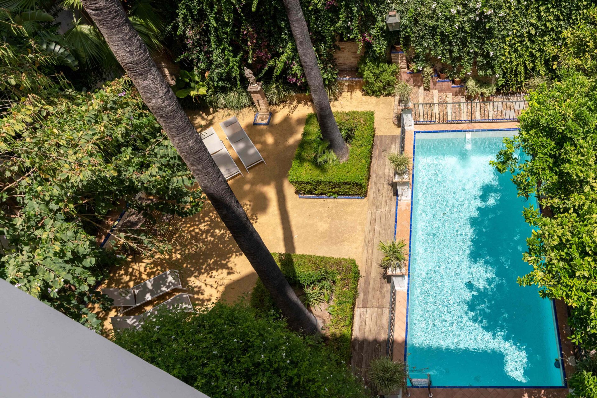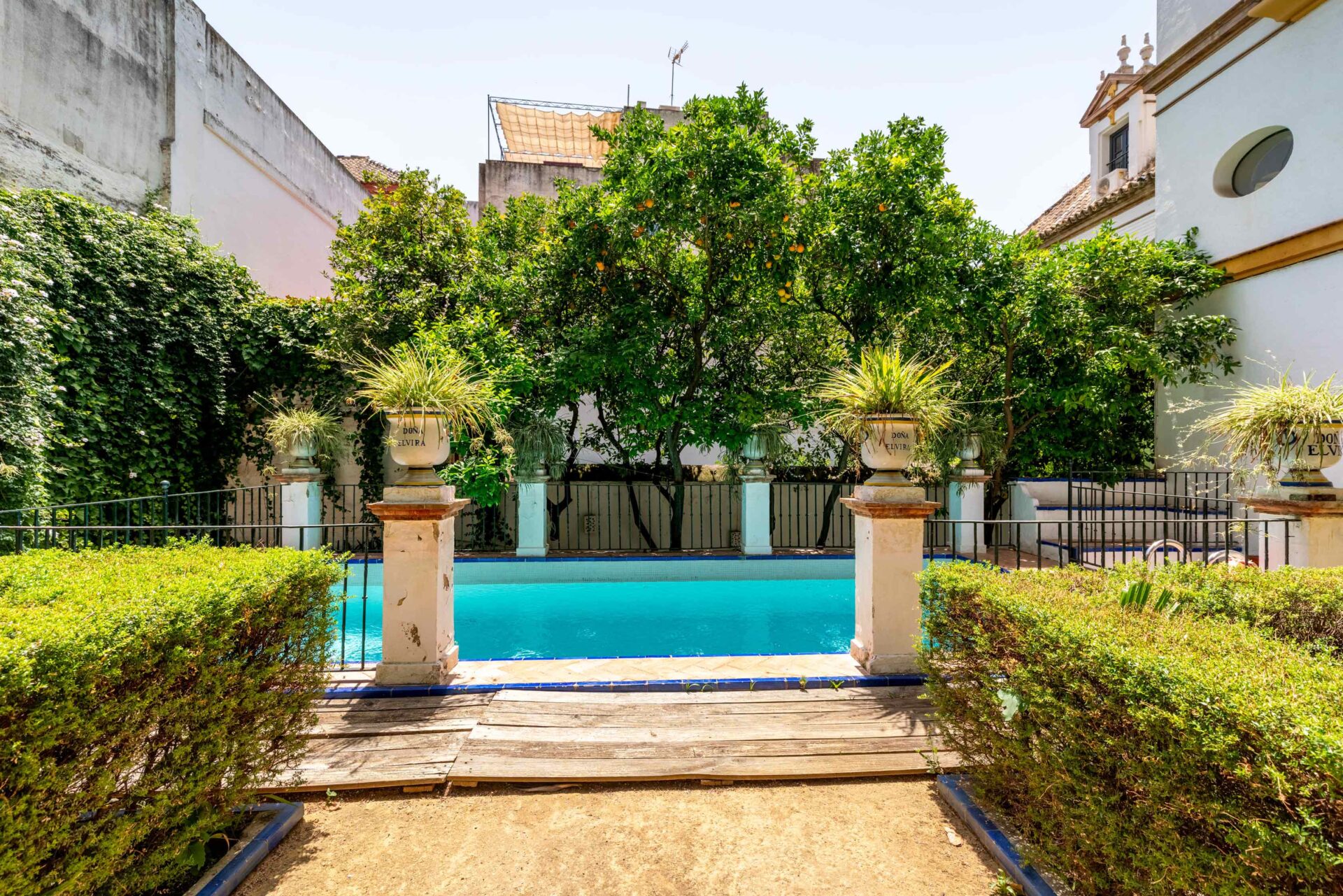 Su fachada da a los naranjos de la plaza de Doña Elvira, considerada la mas bella de Sevilla, a 2 minutos de los Reales Alcázares y a 5 minutos andando de la Catedral, en el Barrio de Santa Cruz.